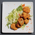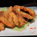 Tiras de peito de frango panadas e fritas até ficarem douradas e crocantes.