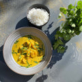 Camarão suculento em molho de caril cremoso, acompanhado de arroz basmati aromático.