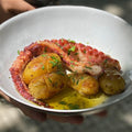 Polvo macio grelhado, com batata a murro e grelos salteados.