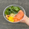 Quinoa solta com espinafres frescos, salmão curado, manga suculenta e avelã crocante. Uma salada nutritiva com contraste de texturas e sabores.