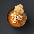 Um caldo rico em sabores do oceano, onde peixe fresco, camarão, lulas, robalo e dourada se unem a legumes e ervas aromáticas.