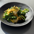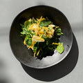 Clássico Bacalhau à Brás, com batata palha e ovo cremoso, finalizado com espinafre fresco para um toque de cor e frescura.