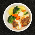 Lombo de bacalhau cozido, de sabor delicado, acompanhado de duas guarnições à sua escolha: feijão verde, brócolo, cenoura cozida, espinafre fresco, arroz basmati ou batata cozida.