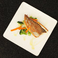 Filete de robalo grelhado, servido com duas guarnições à escolha: feijão verde, brócolo, cenoura cozida, espinafre fresco, arroz basmati ou batata cozida.